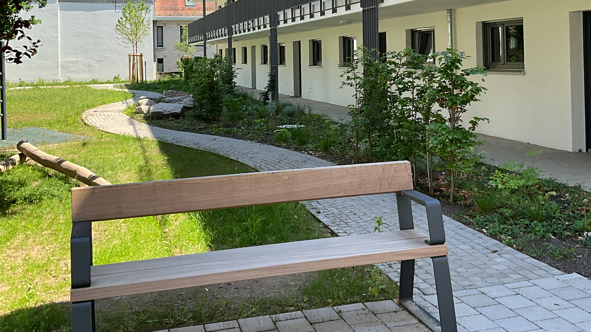 Der „Geranienhof“ verfügt über eine gemeinsame Tiefgarage und einen grünen Innenhof mit dem Pflegeheim. Hier wird die Aktivität und Geselligkeit der Bewohner durch Fitnessgeräte, einen Parcours aus Naturmaterialien und ein Karussell gefördert.
