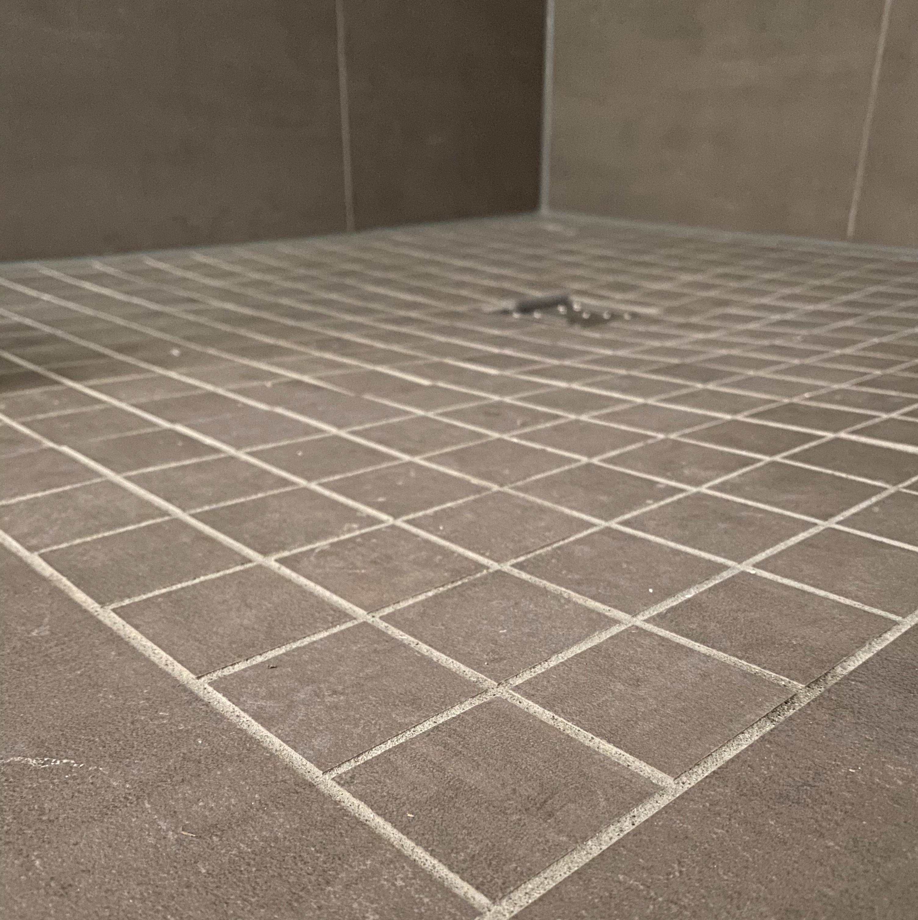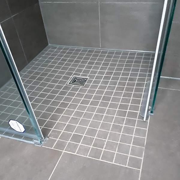 Die bodengleich gefliesten Duschböden mit punktuellem Bodenablauf und einem entsprechenden Fliesengefälle zieren Mittelmosaikfliesen.